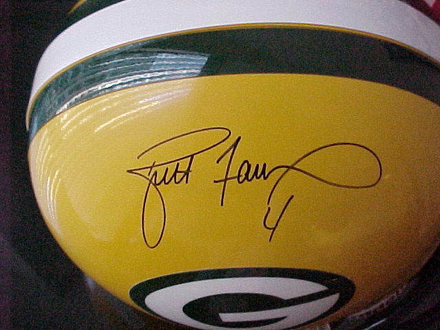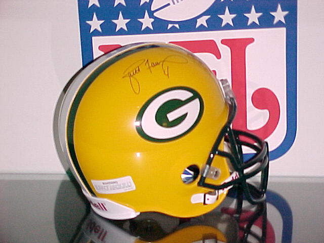 NFL Fans and Collectors! Bid today on this authentic Packers Replica helmet signed by future Hall of Fame Quarterback Brett Favre. The only 3 time MVP in League history, Favre has already secured a position as one of the all time greats. So now is your chance to own this helmet and make an invaluable addition to your collection. Proceeds benefit the Favre Forward Foundation benefiting disabled and disadvantaged children in Mississippi and Wisconsin.